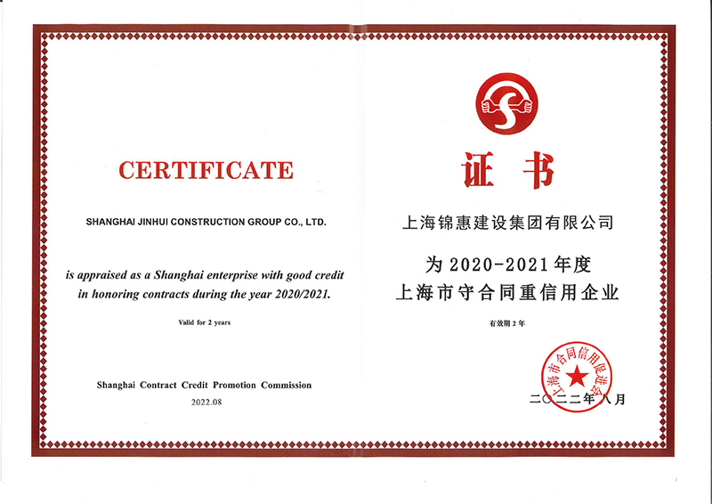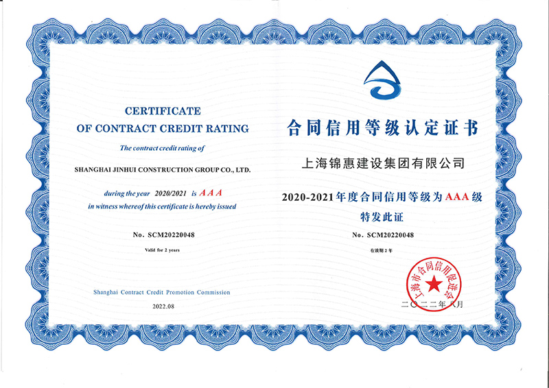 日前,上海錦惠建設集團有限公司被上海市合同信用促進(jìn)會(huì )授予了“2020-2021年度上海市守合同重信用企業(yè)”的榮譽(yù)稱(chēng)號,我公司的合同信用等級也被認定為“AAA級”。自2003年開(kāi)始參加這項評比以來(lái),公司已連續十次獲評此項殊榮。