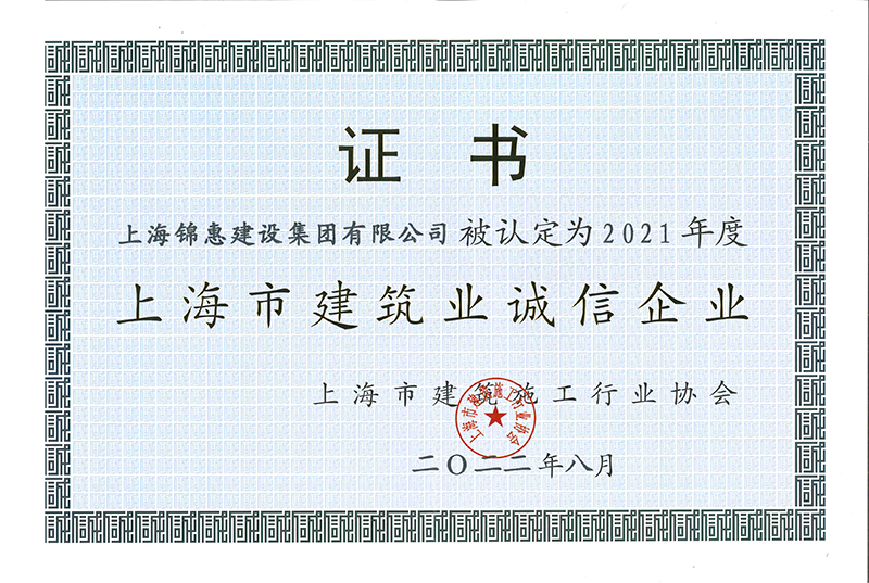 此外,錦惠集團還被上海市建筑施工行業(yè)協(xié)會(huì )授予了 “2021年度上海市建筑業(yè)誠信企業(yè)”的稱(chēng)號。